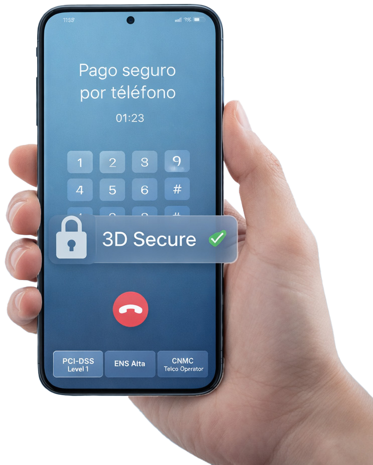 Pay by Call actúa como una capa IVR segura: el cliente introduce los datos directamente, sin exposición a agentes ni grabaciones
